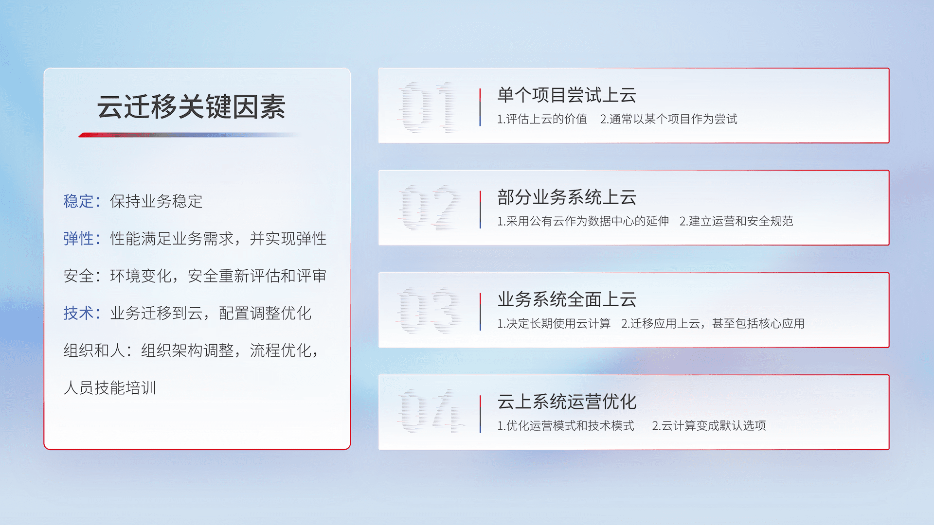 结合实际业务,,,从规划设计、、云平台选型、、、云原生改造、、、、数据迁移、、集成交付,,迁移全过程为客户识别最佳上云路径,,,做好风险识别管理,,设计网络架构、、、身份权限、、、安全审计合规、、操作审计、、、、日志审计、、、、监控告警策略、、、、多站点容灾设计等,,,,对云上基础设施进行整体规划,,,,提升IT治理水平,,,以满足弹性、、、、高可用、、高性能的需求。。