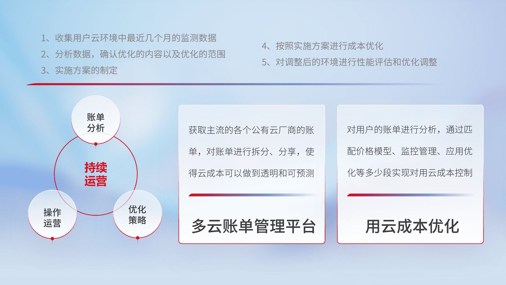 通过多云纳管,,,,以统一的资源数据模型把客户的云资源进行抽象和封装,,,,进而实现对多云资源的统一操作,,,保障云资源管理的可靠性、、、稳定性与可用性。。量身定制化运维内容,,,配置、、开发运维、、补丁管理、、备份、、、、监控、、、、认证和访问管理、、、、审计和日常巡检等,,,保障在用云过程中的可靠度,,稳定度以及高可用率。。。。